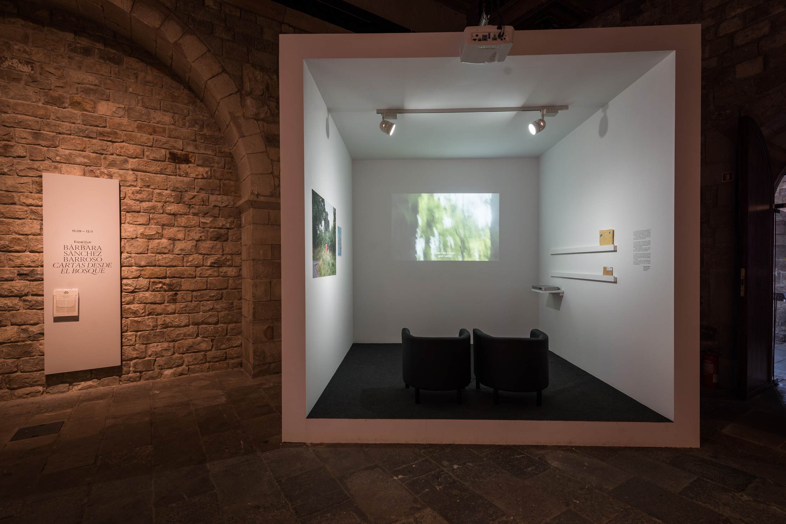 When the artist arrived in the forest she found a typical English red post box in front of the house she would live in. For some time she had wanted to work with correspondence as an artistic project and she chose to do so through video letters, filmed letters that pay tribute to the critical documentary of Chris Marker and Harun Farocki, the mystical and psychological dimension of Tarkovsky’s cinema and the poetic correspondence between Víctor Erice and Abbas Kiarostami. She will send them to La Capella weekly and the postman will deposit them in a similar post box placed at the entrance to La Capella on Carrer Hospital. They are addressed to any spectator who sits down to “read them/watch them” at Espai Cub, and they can be “responded to” by depositing the correspondence in the same post box, following the instructions at the gallery.
